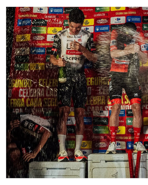 ........... ....а в Мадриде, вчера! Вечером, уже на парковке отеля, из ящиков соорудили импровизированный подиум, а командные автобусы превратились в гримёрки подняли главный трофей Вуэльты — без фанфар, при вспышках камер смартфонов и аплодисменты товарищей по пелотону. Стрельнули шампанским!