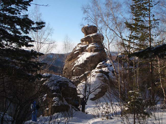 На вершине Церковки открывается замечательный вид на Бийскую равнину, подступающую к горам, на город Белокуриху, на курортную зону с санаториями и на волнистые гребни гор Чергинского хребта. Налюбовавшись панорамой, можно продолжить прогулку по гребню горы. Можно перекусить в кафе, окна которого смотрят на горы. Рядом с кафе стоит небольшой телескоп. Недалеко от кафе находится скульптура, напоминающая рогатый колокол. По сосновому лесу идет широкая тропинка. Минут через пять она приводит к скале Церковка. По пути установлено много скамеек для отдыха и созерцания горного пейзажа. По бокам от тропинки встречается много скал-останцев, по которым можно полазить, но скалу Церковку невозможно с ними спутать. Она стоит на краю крутого спуска с гребня горы. Скала образована большими выветренными глыбами — скалами-останцами. И от основания к вершине сужается. Вершиной скалы является глыба-луковка, похожая на церковный купол, на ней установлен крест. На этом месте невольно восхищаешься гениальным архитектором — природой, создавшей такой законченный и узнаваемый образ православного храма. У восточной стороны скалы в прошлые века росло священное дерево алтайцев и стояла часовня. Рядом со скалой Церковка обычно кормят синичек (не забудьте захватить семечки). Птицы так привыкли к людям, что садятся прямо на руку кормящих.
