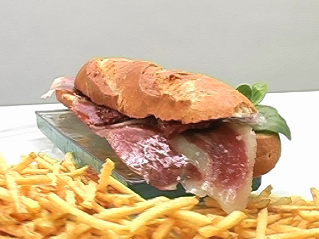 Багет с самой нежной ветчиной на свете.Состав:Иберская ветчина — 5 кусочков;багет — 1 штука;салат — 3 веточки;чеснок — 1 зубчик;несколько сушеных помидор;оливковое масло — по вкусу.