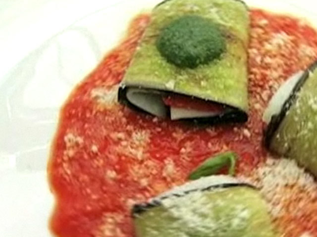 Рецепт рулетиков из баклажанов с соусом.Состав: баклажан — 1 штука;оливковое масло — 1 столовая ложка;сливочное масло — 10 гр;песто — 80 гр;томатный соус — 3 столовых ложки;пармезан — 2 столовых ложки;жареные перцы, моцарелла.