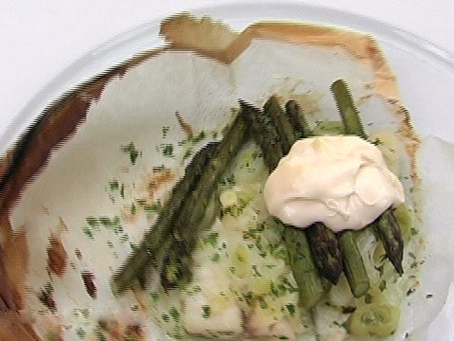 Рыбная горячая закуска подходит даже для праздничного стола.Состав:хек — 2 штуки;спаржа — 6 штук;лук — 2 штуки;майонез — 2 столовых ложки;белое вино — 2 столовых ложки;оливковое масло, белый перец, соль, петрушка — по вкусу.